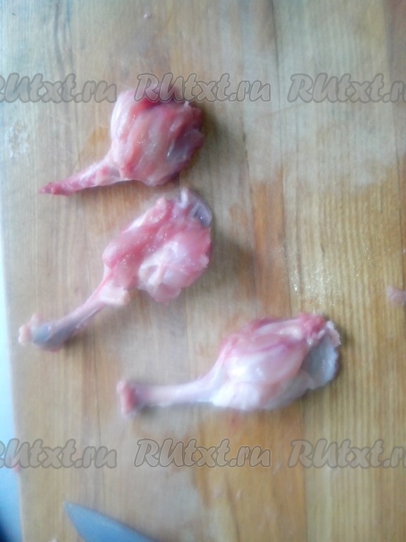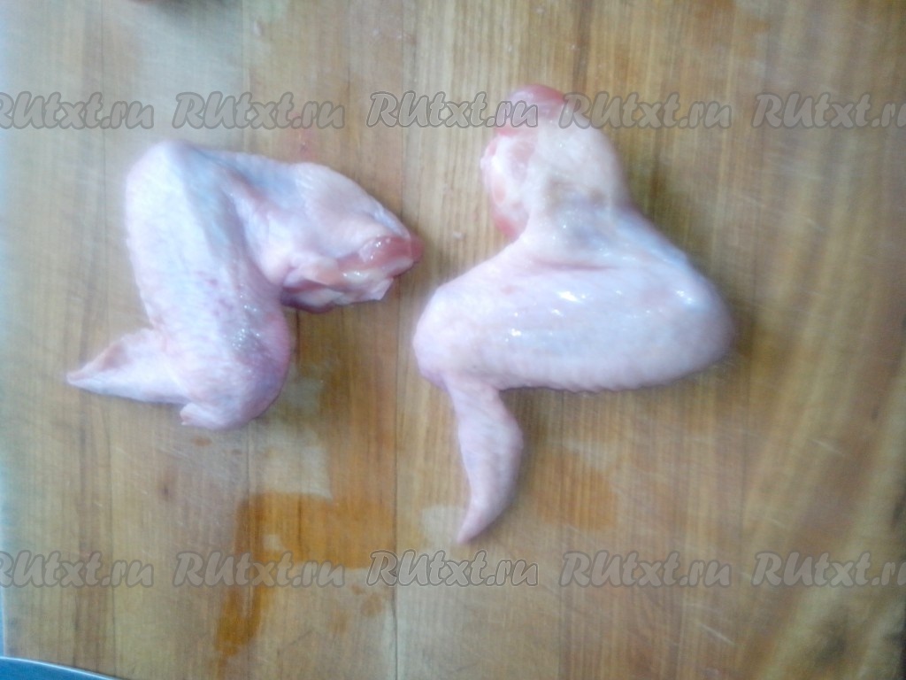 Верхнюю часть крылышка отрезаем. И аккуратно зачищаем кожей и мясом во внутрь. Солим, перчим, сбрызгиваем соком апельсина, даем промариноваться пару часиков.