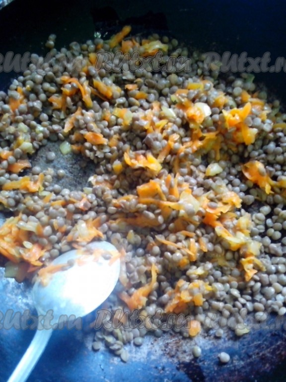 На гарнир отварил чечевицу, добавил в нее немного обжаренной моркови с луком.