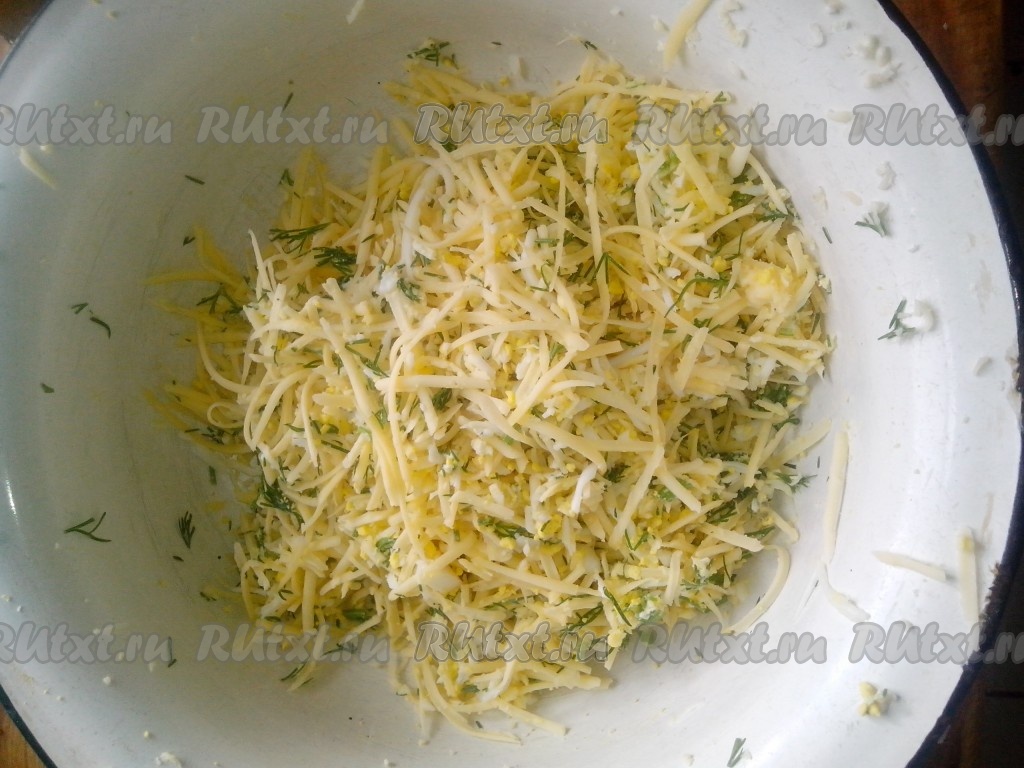 Натираем сыр на мелкой терке, добавляем нарезанную зелень, немного цедры апельсина и замороженного сливочного масла, перемешиваем.