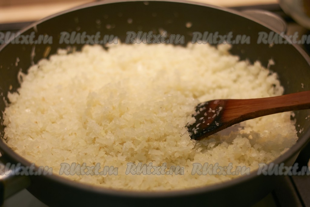 Капусту мелко режем, удобно это сделать в кухонном комбайне, если капуста сочная, то обязательно убираем сок (отжимаем капусту). Солим, перчим и обжариваем под крышкой на небольшом количестве подсолнечного масла, примерно минут 10, иногда помешивая. Следим, чтобы капуста не подгорала и не румянилась.