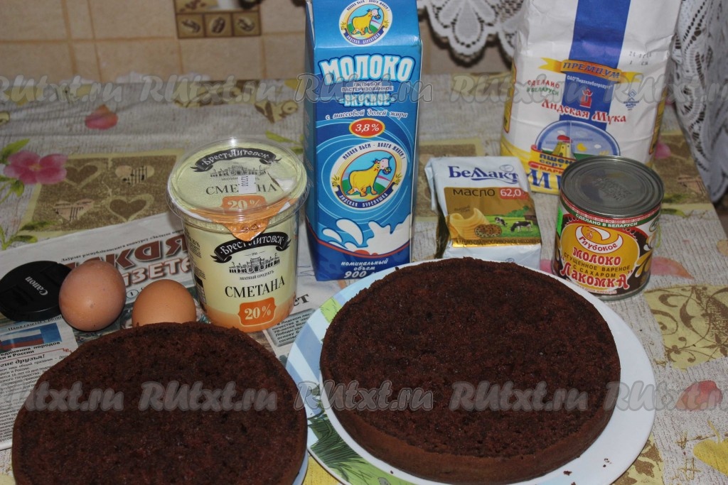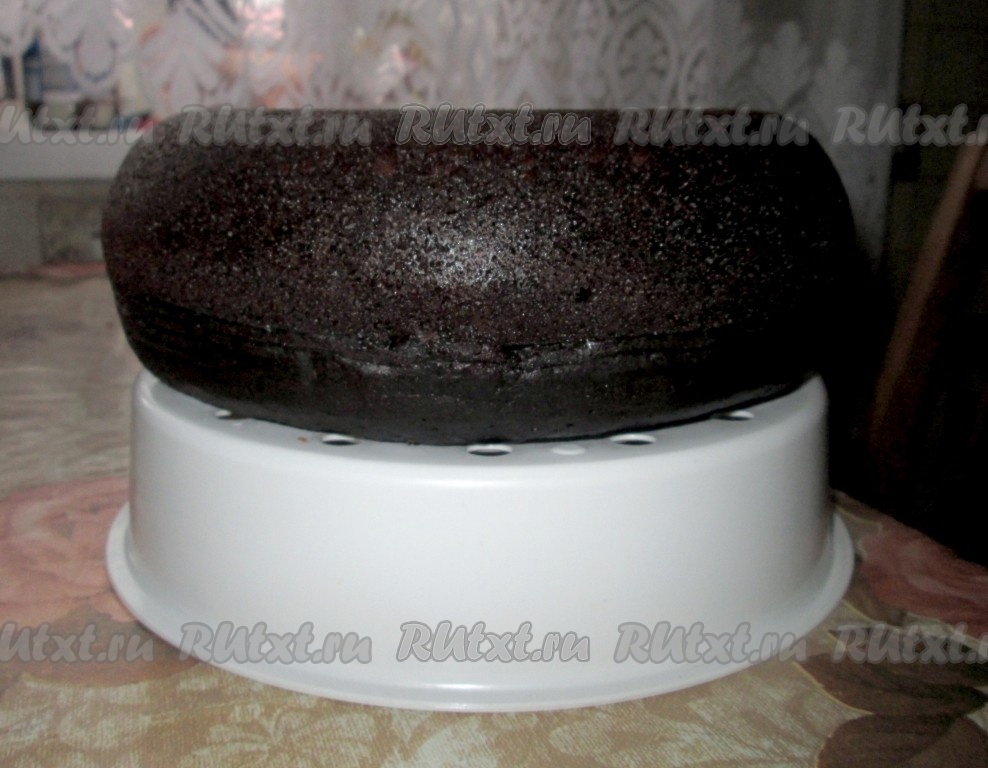 Готовый корж остудить, разрезать на несколько частей и пропитать коржи кремом (я приготовила крем из сметаны+сахар). Можно добавить вишню.