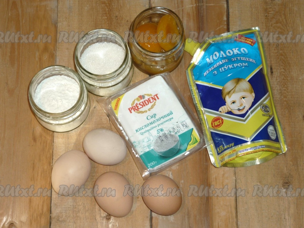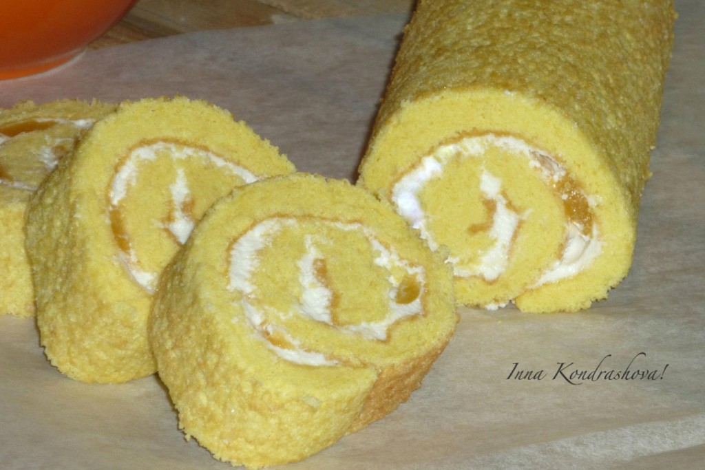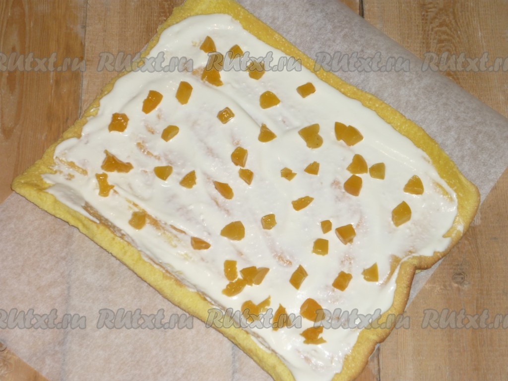Остывший рулет развернуть и смазать творожным кремом. Сверху равномерно выложить абрикосы, нарезанные кусочками.