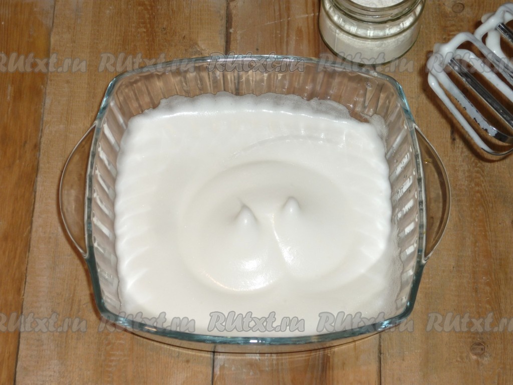 Желтки взбить с оставшимся сахаром до побеления. Соединить белки с желтками и аккуратно перемешать снизу вверх.
