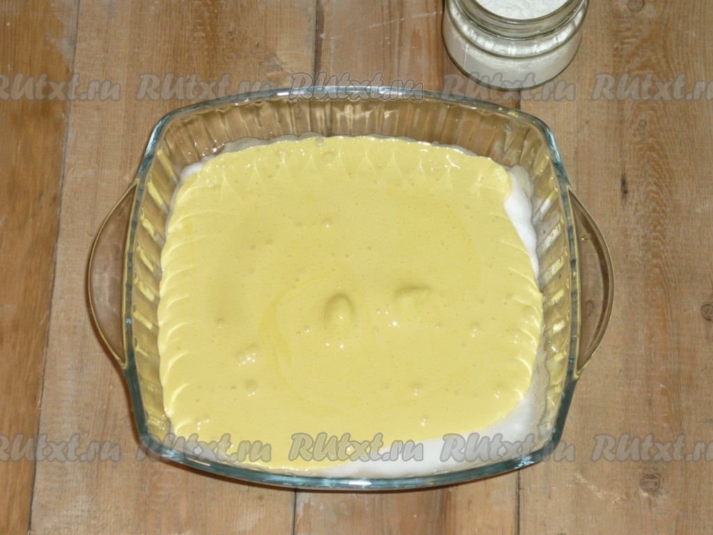 Муку просеять и ввести в яичную массу. Аккуратно перемешать. Должно получиться воздушное бисквитное тесто, по консистенции, как густая сметана. Противень застелить пергаментом и вылить тесто, разровнять.