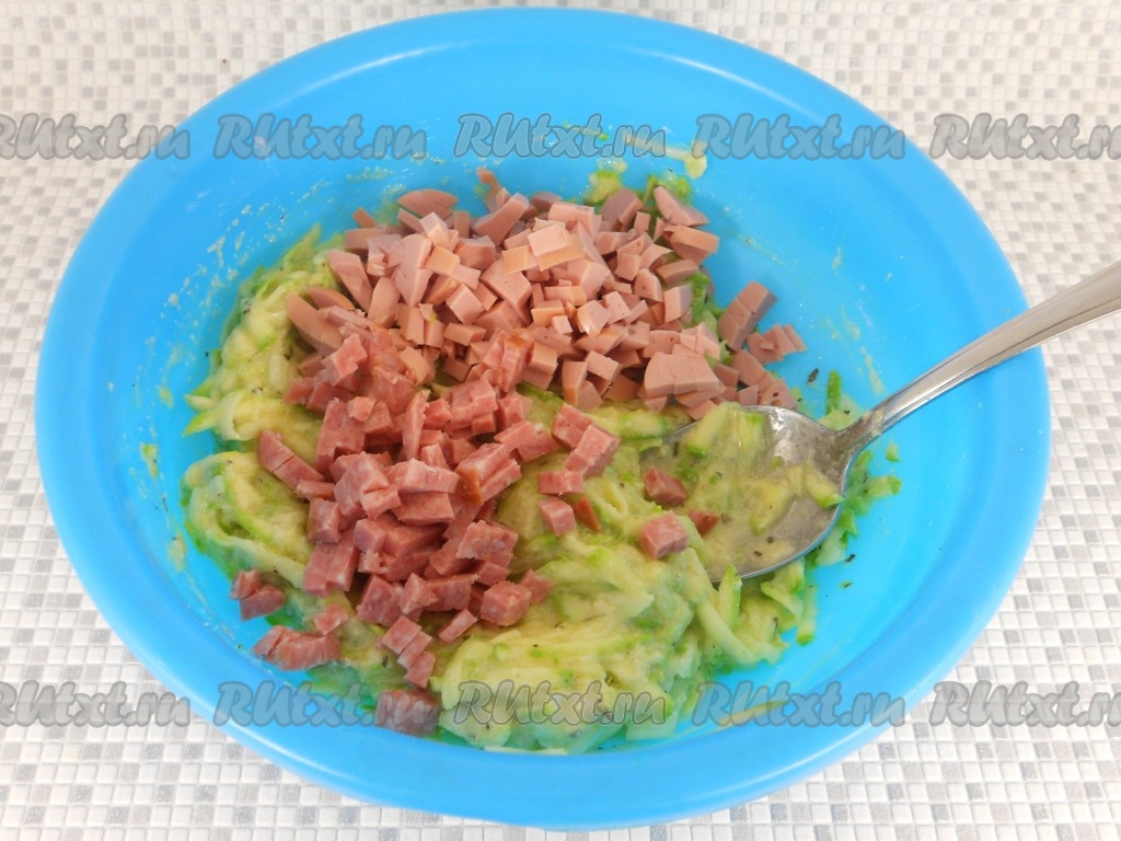 Снова все тщательно перемешать и добавить нарезанную мелкими кубиками колбасу двух видов (можете использовать любую колбасу).