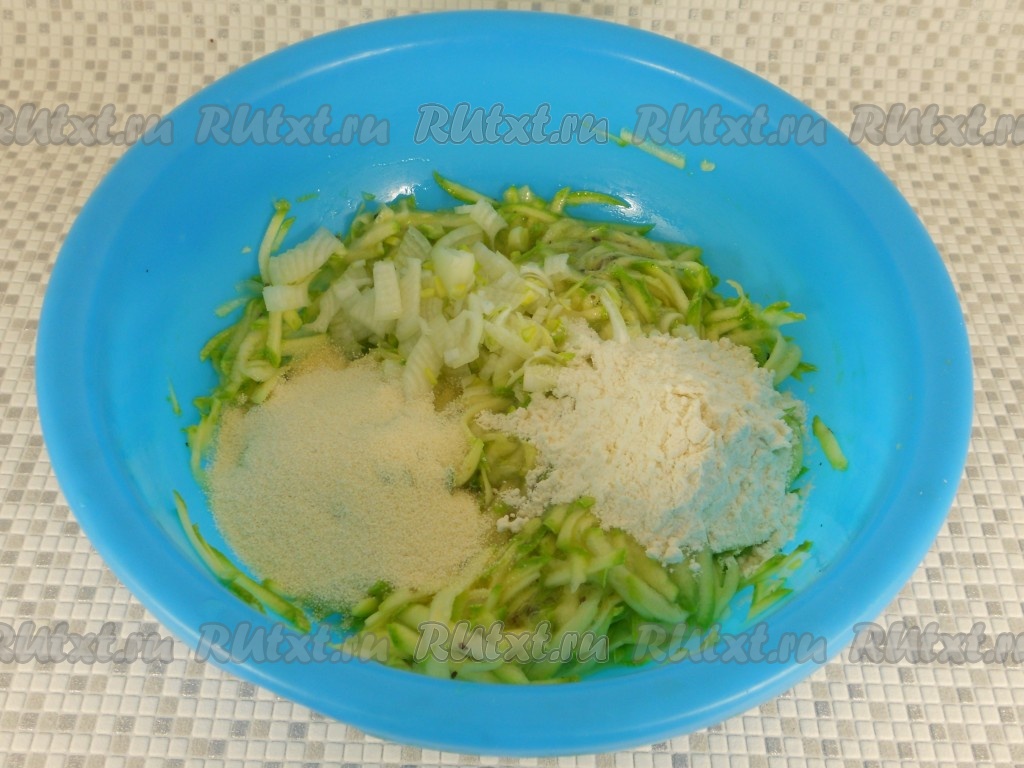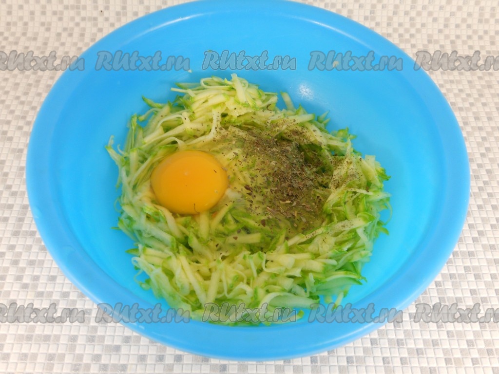 Кабачки натереть на крупной терке (если кабачки молодые, шкурку можно не срезать), добавить яйцо, посыпать специями и перцем.
