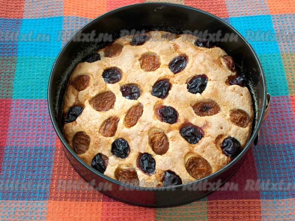 Поставить пирог в духовку, нагретую до 180 градусов, и выпекать 45 минут (верх пирога должен подрумяниться). Готовность проверить, проколов пирог сухой деревянной шпажкой (если шпажка после прокола останется и сухой, и чистой, значит выпечка готова).