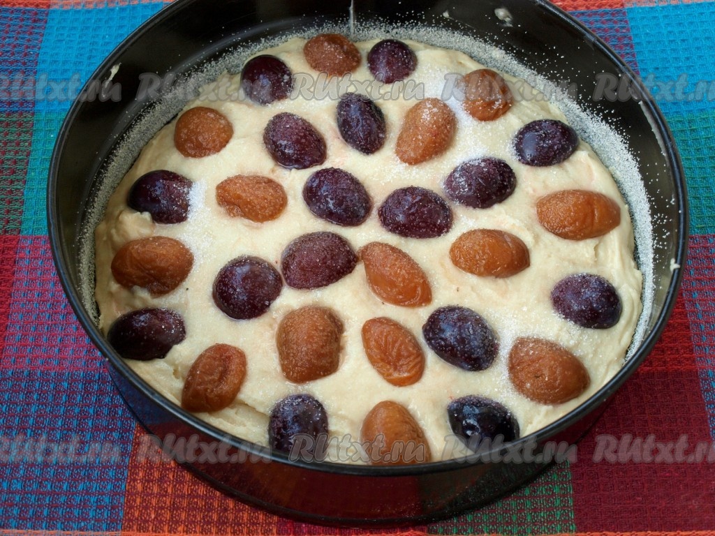 Дно и бока формы для выпечки смазать сливочным маслом, я ещё дополнительно присыпала манкой, чтобы готовый пирог лучше отходил от формы. Затем выложить тесто, разровнять и сверху разложить фрукты.