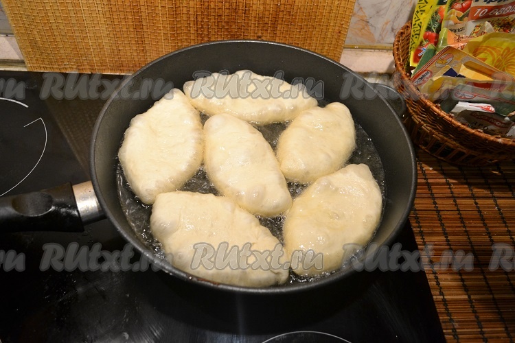 Сковороду с толстыми стенками ставим на огонь, добавляем растительное масло (я лью столько масла, чтобы оно покрыло пирожок примерно до половины высоты) и ждём, когда масло хорошо нагреется. Пирожки выкладываем швом вниз на хорошо разогретую сковороду. Они сразу же увеличатся в размере.