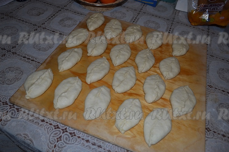 Каждый шарик руками разминаем в лепёшку, в середину кладём желаемое количество начинки (например, тушёную капусту или грибы, жареные с луком), защипываем края лепёшки, формируя пирожок с начинкой. Сформированный пирожок немного приминаем ладонью.