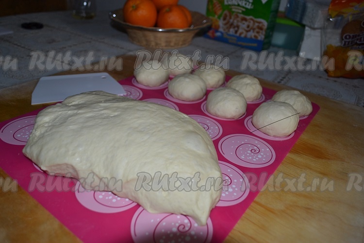 Тесто кладём в миску. Прикрываем миску полотенцем (или плёнкой) и ставим в тёплое место часа на 1,5 (до увеличения в объёме раза в 2). Я тесто поставила в духовку и включила подсветку. Духовка в таком режиме у меня держит температуру 30 градусов. Через 1,5 часа тесто увеличилось вдвое. Подошедшее тесто я разделила на 20 равных частей, накрыла плёнкой и оставила ещё минут на 45 для подъёма.