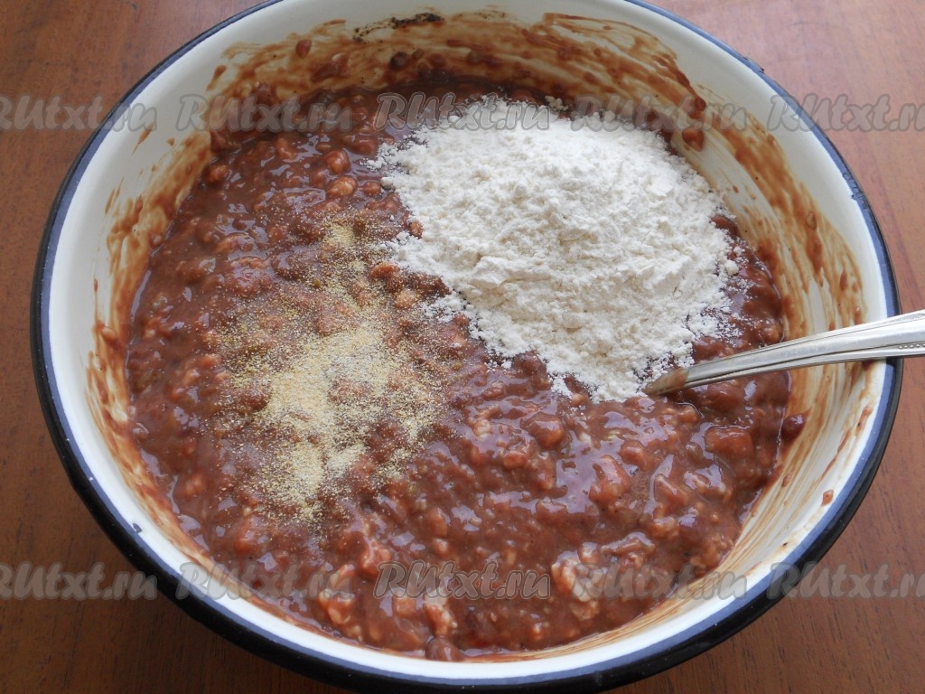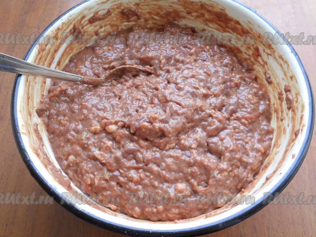 Еще раз фарш тщательно перемешать. Тесто для печеночных котлет получится достаточно густым.