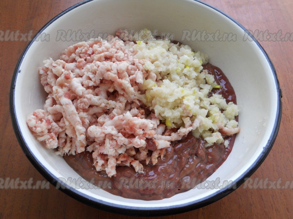 Печень вместе с салом и луком перекрутить на мясорубке.