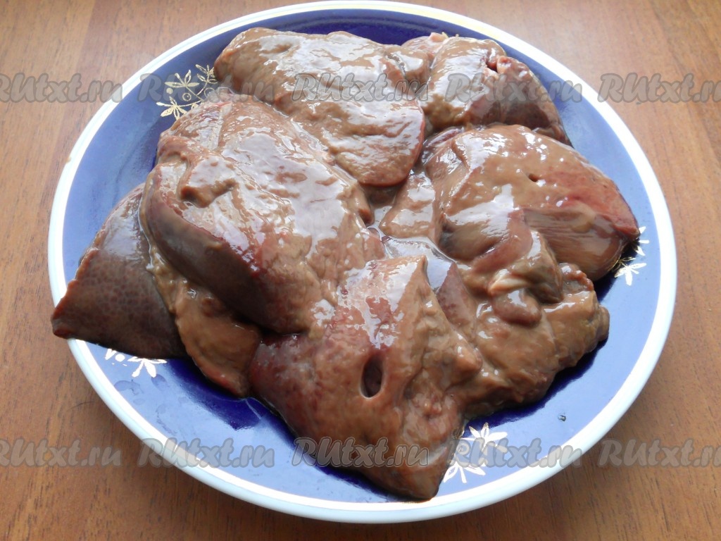 Свиную печень нарезать кусками и вымочить ее 2 часа в немного подсоленной воде. Затем печень обсушить бумажным полотенцем.
