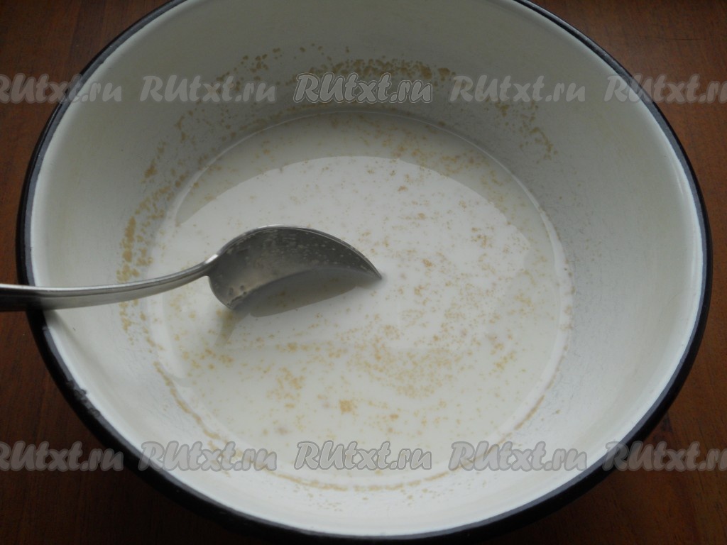 Молоко подогреть до теплого состояния, растворить в нем дрожжи, всыпать сахар, соль и ванильный сахар. Перемешать.