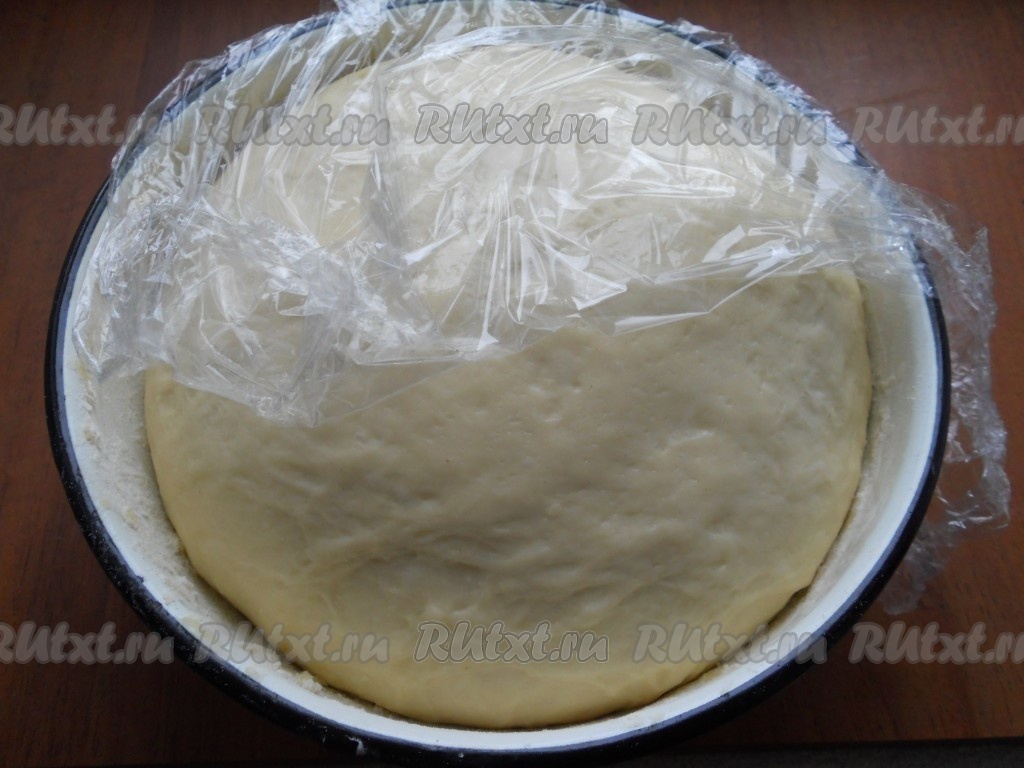 Накрыть посуду с тестом пленкой и оставить в теплом месте на 1 час. После этого тесто нужно хорошо вымесить, чтобы оно не липло к рукам и поверхности. Также накрыть пленкой и оставить для подхода еще на 1 час в теплом месте. Тесто хорошо поднимется.