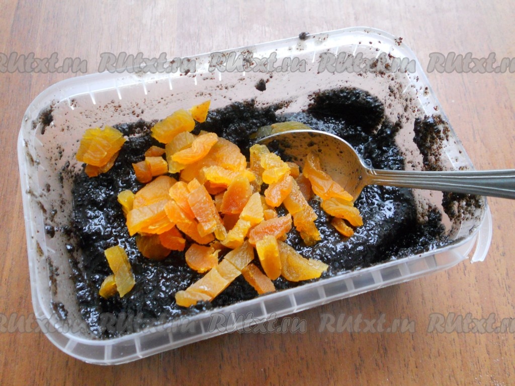 В готовую маковую начинку (продается в магазинах) добавить нарезанную кусочками курагу, перемешать.