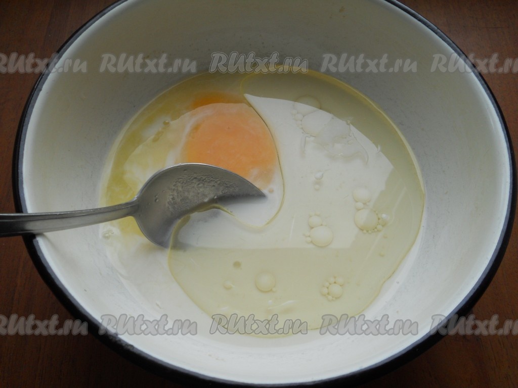 Добавить в молочную смесь сырое яйцо и влить растительное масло. Тщательно перемешать венчиком.