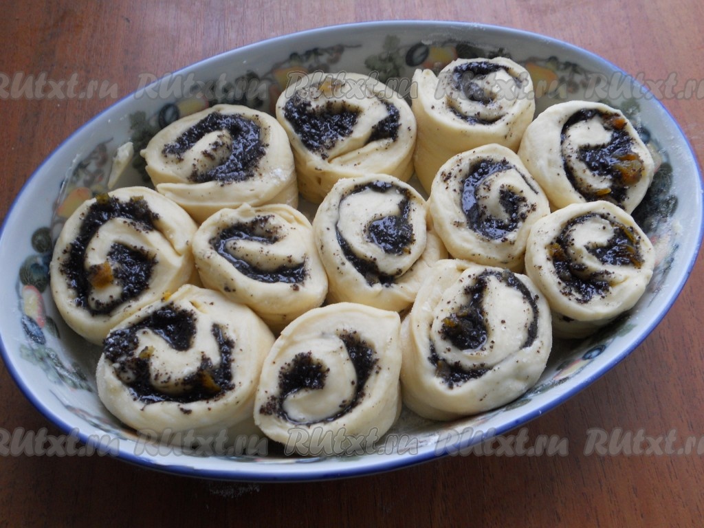 Свернуть в рулет и разрезать на части длиной около 5-6 см. Форму для выпечки смазать сливочным маслом и немного присыпать мукой. Выкладывать в форму рулетики вертикально.