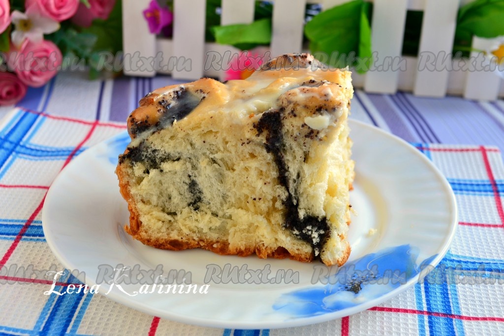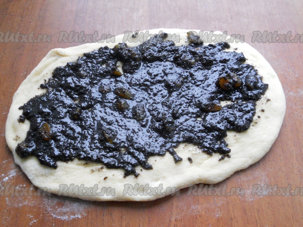 Каждую часть теста раскатать прямоугольником или овалом, толщиной около 1 см. Выложить часть маковой начинки на тесто, размазать по всей поверхности.