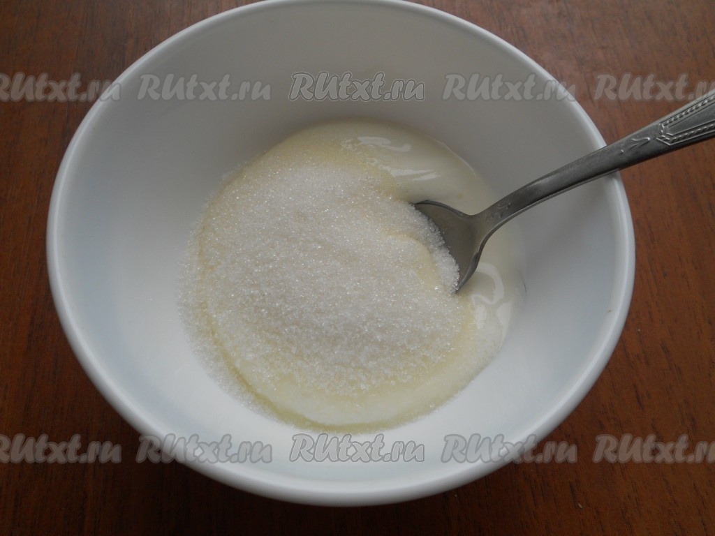 Накрыть форму с рулетиками пленкой и оставить в теплом месте на 25-30 минут. Выпекать булочки в предварительно разогретой до 180 градусов духовке в течение 25-35 минут (смотрите по своей духовке, булочки должны зарумяниться). Приготовить заливку: к сметане добавить сахар и перемешать.