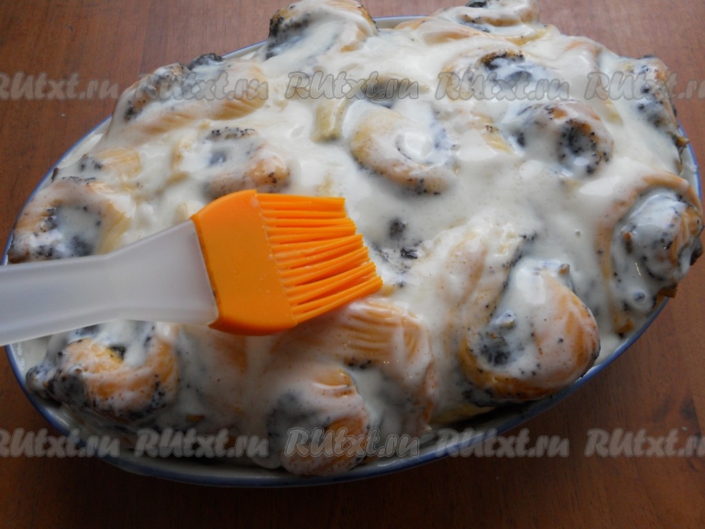 Готовые горячие булочки полить или смазать кисточкой (обильно) сметанной заливкой. Накрыть форму с булочками фольгой и оставить до почти полного остывания.