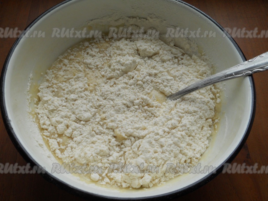 Всыпать просеянную муку, замешивая тесто.
