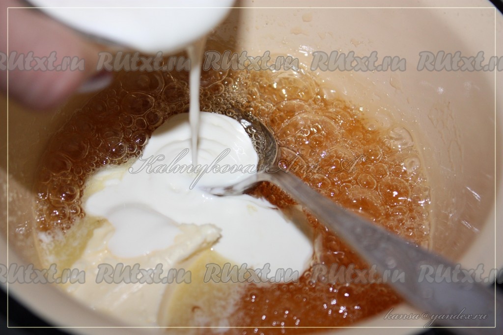 Когда масса немного загустеет, добавить масло сливочное и подогретые (до 60-70 градусов) сливки.