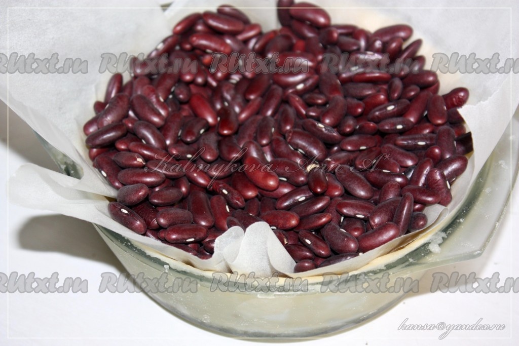 По истечении времени достать тесто из морозилки, накрыть его пергаментом, сверху положить любой утяжелитель (у меня фасоль, в качестве утяжелителя) и отправить в духовку, разогретую до 170 градусов, минут на 15-20.