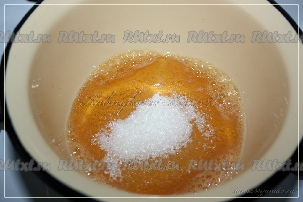 Приступаем к приготовлению карамели. Сироп нагреть и постепенно, помешивая, добавлять сахар.