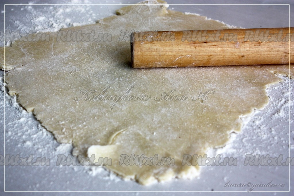 На столе, присыпанном мукой, раскатать тесто в пласт толщиной около 3 мм.