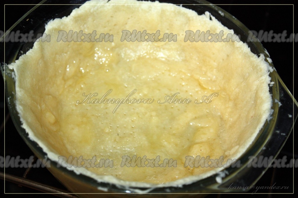Затем пергамент и утяжелитель убрать и выпекать основу для пирога еще минут 15-20 (до румяного цвета).