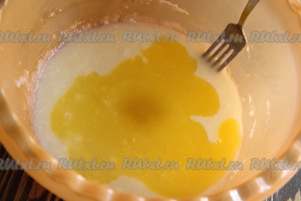 С помощью вилки растереть массу. Масло растопить, охладить и добавить в яично-творожную смесь.