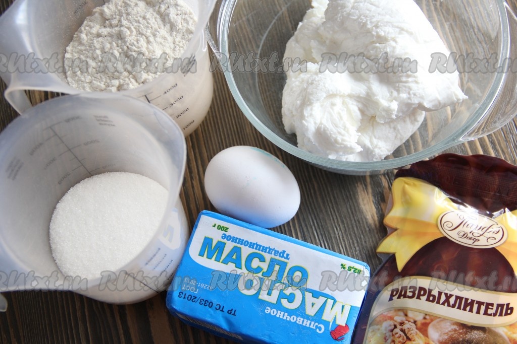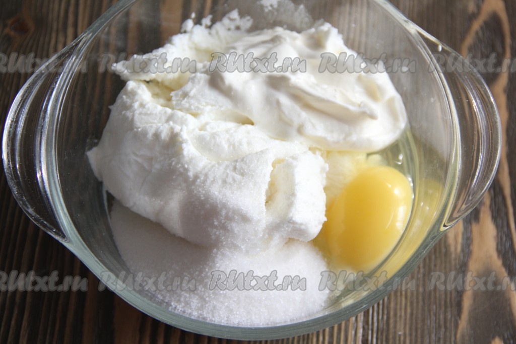 Для приготовления начинки соединить творог, яйцо, сахар, ванильный сахар и сметану.