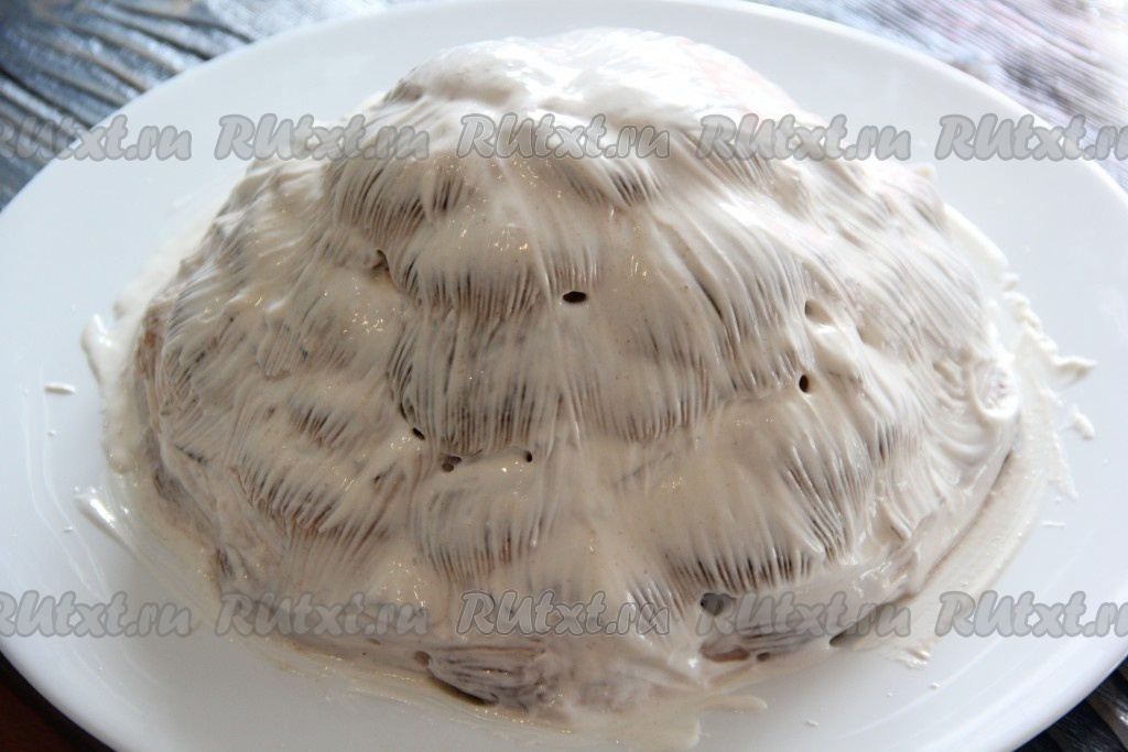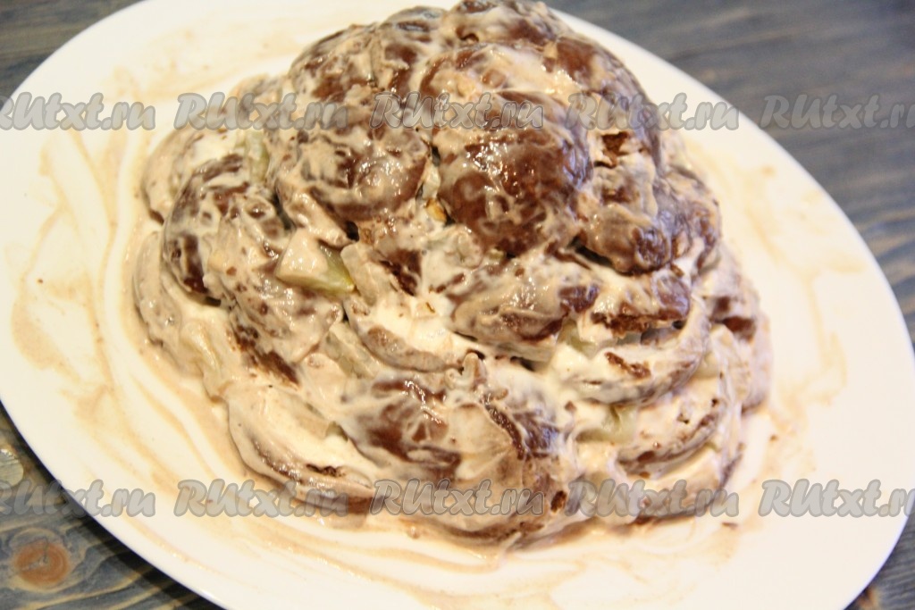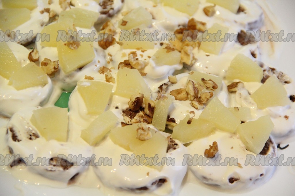 Таким образом, чередуя слои, сформировать торт в виде горки из пряников, покрытых сметаной, и ананасов с орехами.