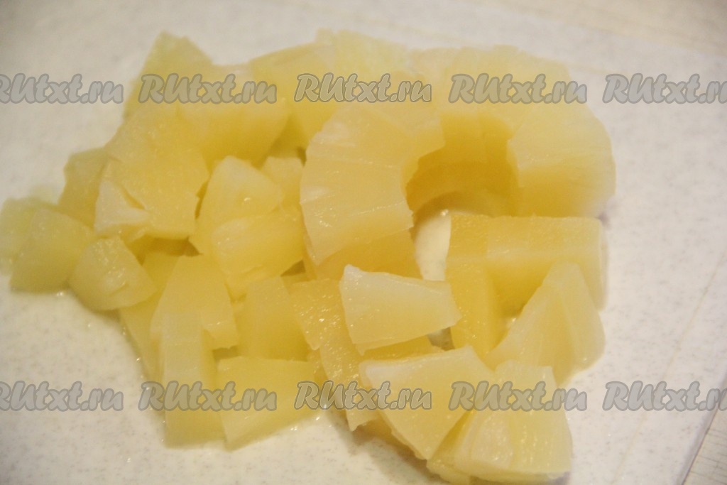 Ананасы нарезать на небольшие кусочки.