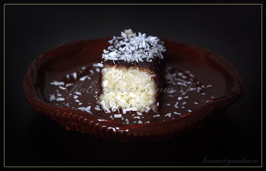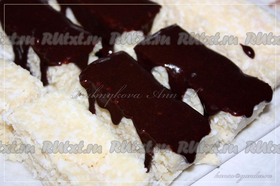 Достать из холодильника заготовку, разрезать порционно и полить шоколадной глазурью, оставить застывать. Хранить кокосовый десерт в холодильнике.