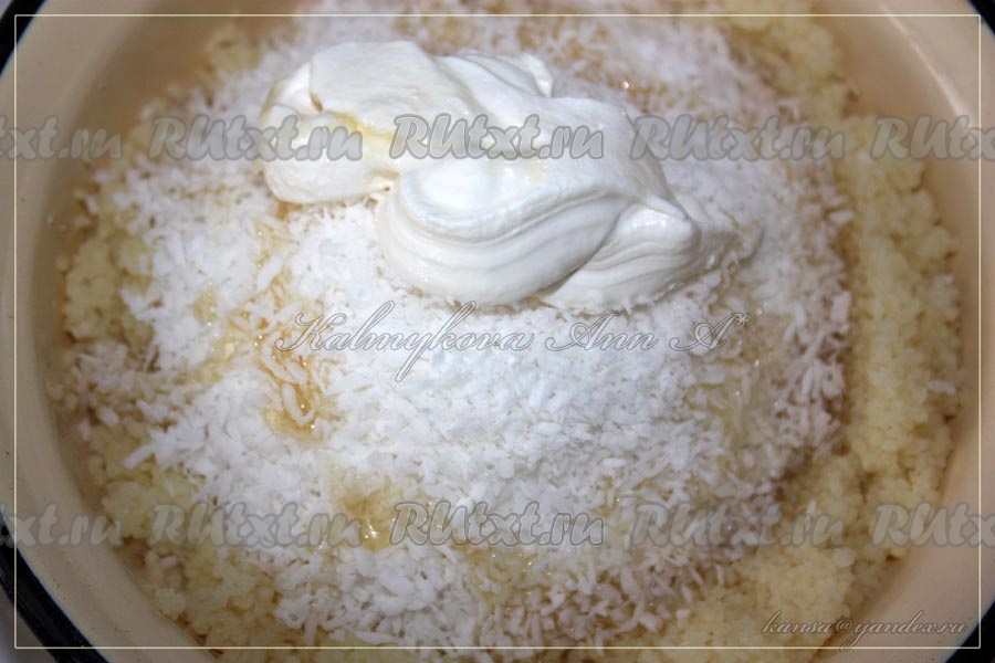 Снять кус кус с огня, добавить кокосовую стружку, ванилин, сироп, сливки и мед, тщательно перемешать.