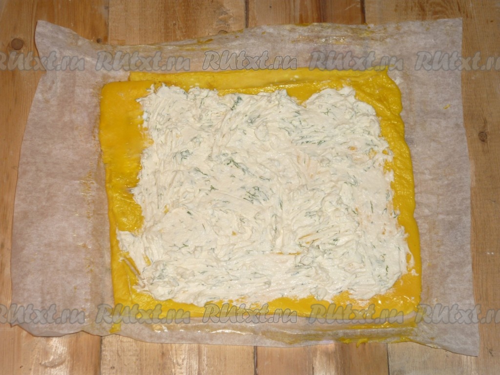 Свернуть яичный пласт в рулет, помогая себе пергаментом. Хорошо прижимая, чтобы в итоге получился плотный, красивый разрез.