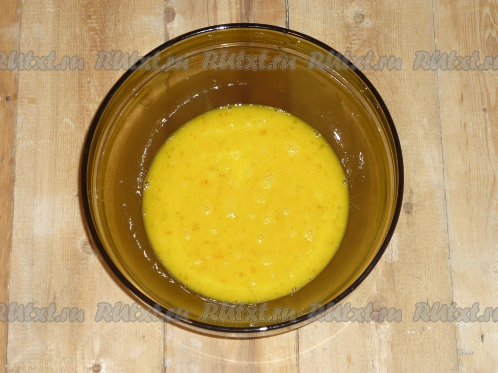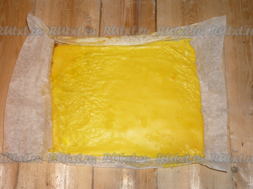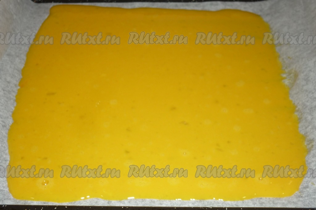 Противень застелить пергаментом. Края бумаги подвернуть кверху, чтобы образовались бортики (это нужно для того, чтобы наша яичная масса не растеклась по всему противню).