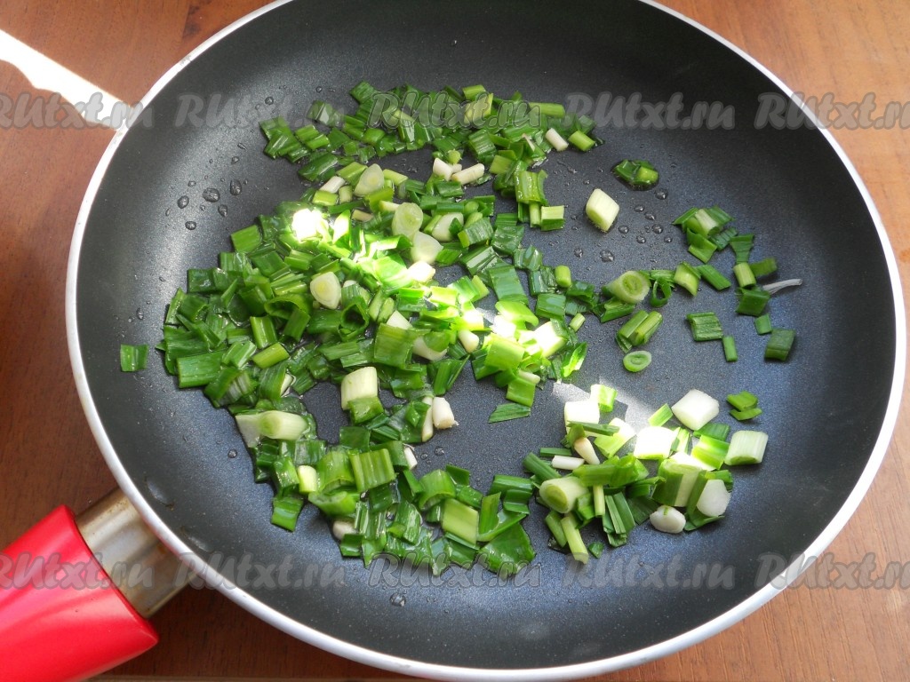 Для приготовления начинки в сковороде разогреть растительное масло, добавить измельченный зеленый лук и зелень чеснока. Постоянно помешивая, обжарить зелень на небольшом огне в течение 2-3 минут.
