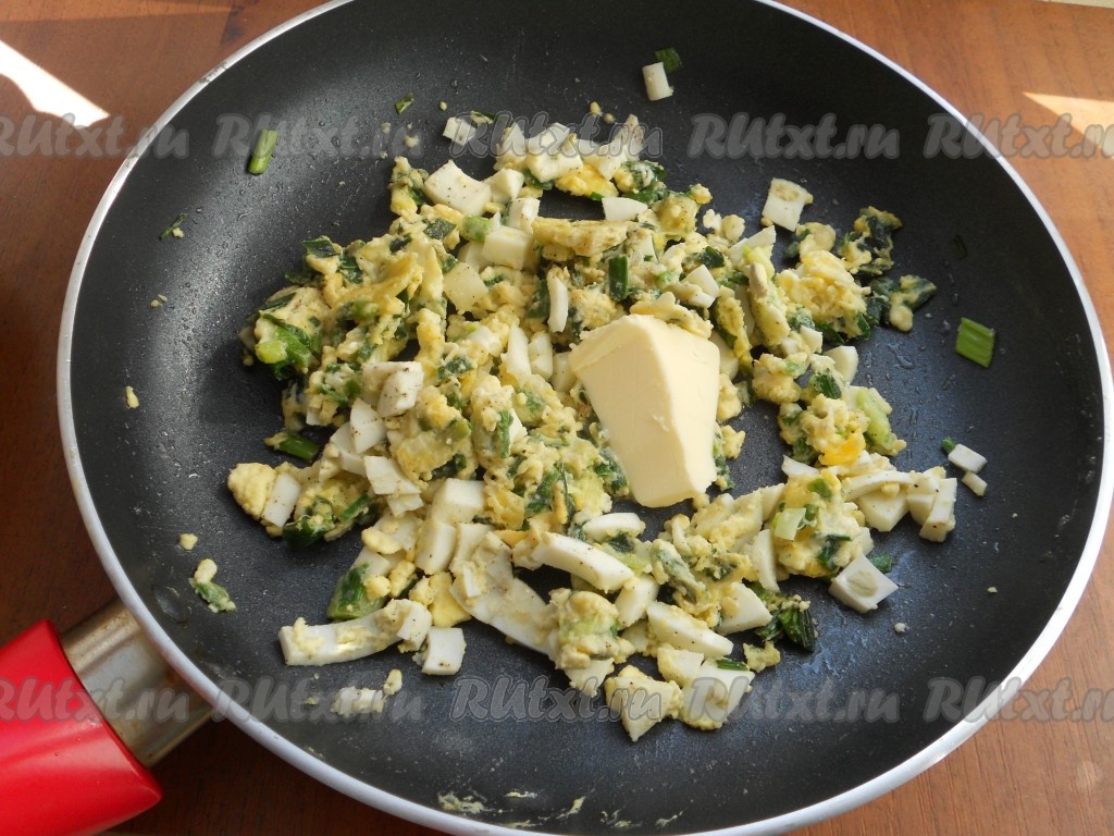 Сюда же добавить рубленные вареные яйца. Посолить и поперчить, подержать на огне 2-3 минуты. Добавить 10 грамм сливочного масла, дать ему растопиться, начинку перемешать и остудить.