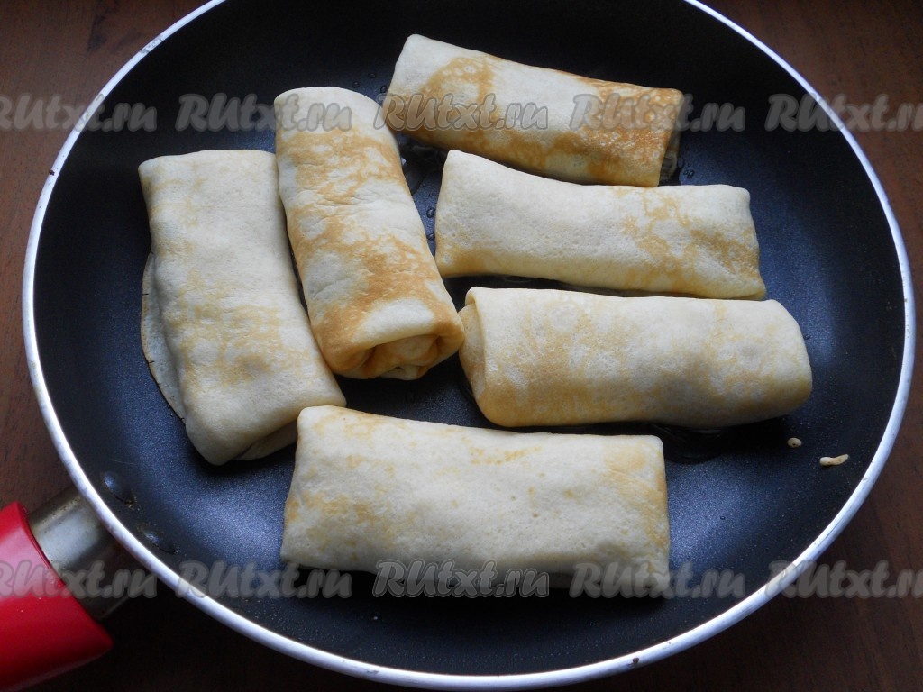 Свернуть блинчик конвертиком или удобным для вас способом. Также подготовить все блины. Затем поместить их на сковороду с растопленным сливочным маслом.