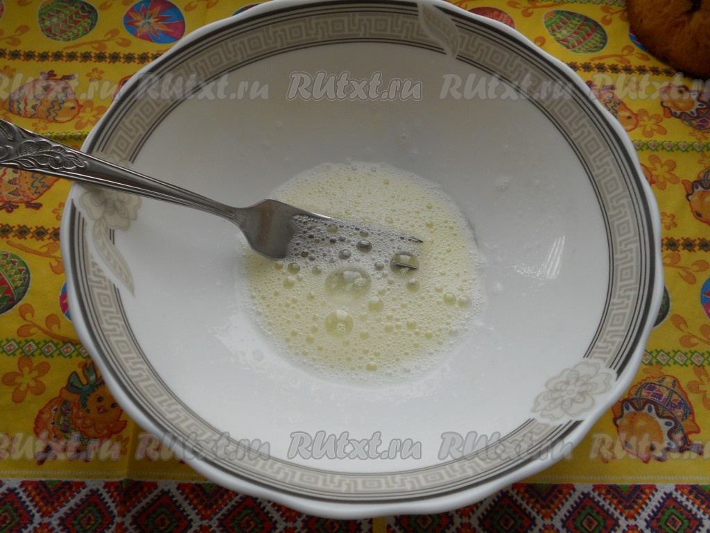 Яичный белок поместить в миску. Взбить его (расколотить) хорошенько вилкой.