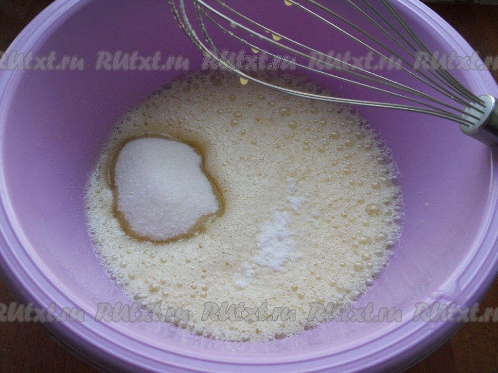 Добавить к яйцам соль, взбить венчиком до пышной пены. К яйцам добавить жидкий мед, всыпать сахар и ванилин. Тщательно перемешать.