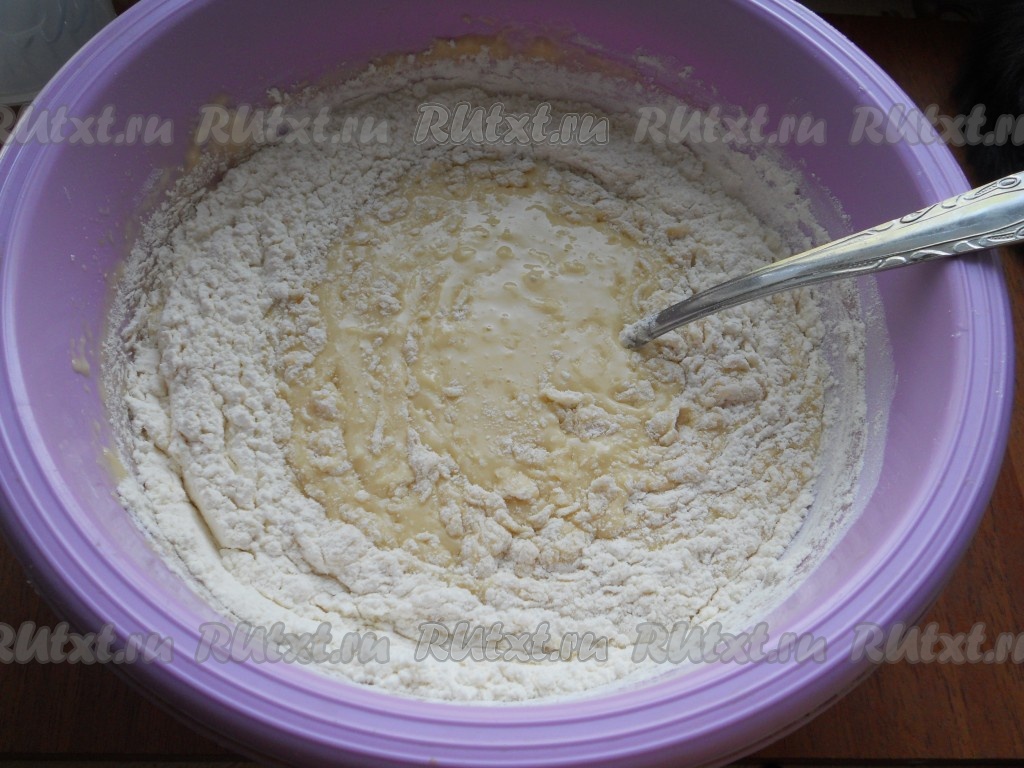 Влить в яичную смесь опару и растопленное масло, перемешать и частями всыпать муку, замешивая тесто.