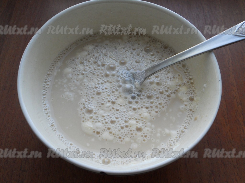 В глубокую чашу влить теплую воду, добавить 1 столовую ложку сахара, всыпать дрожжи. Добавить 2 столовые ложки муки и тщательно все перемешать, дрожжи должны практически раствориться. Накрыть посуду с опарой пищевой пленкой и оставить в теплом месте на 10-15 минут.
