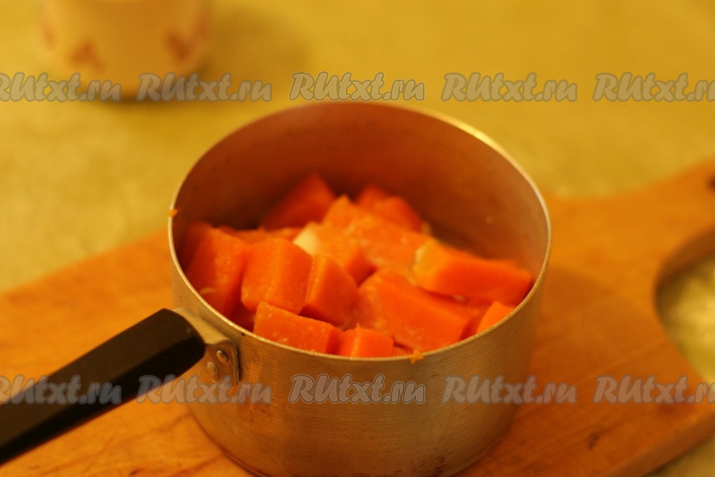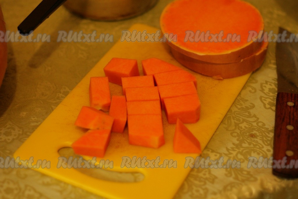 Тыкву очистить. Мякоть тыквы нарезать на небольшие кусочки.