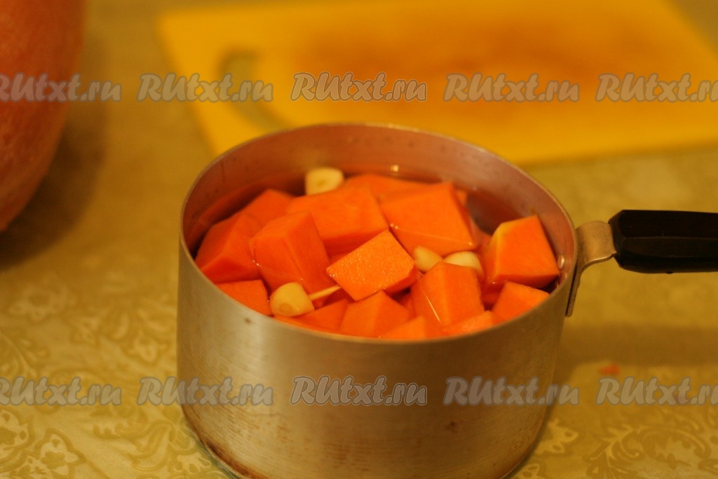 Чеснок разрезать на 2 половинки. Отварить тыкву в воде вместе с чесноком и солью в течение 20 минут.