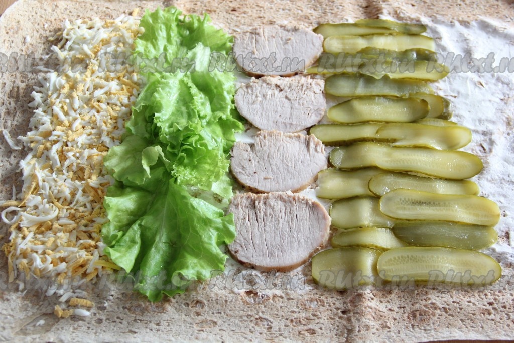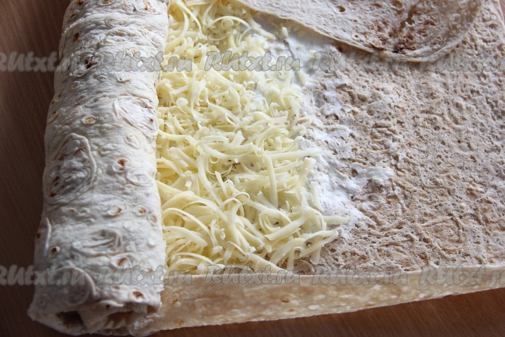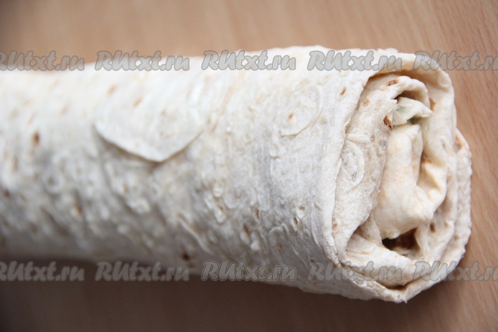 Подвернуть вначале длинные края лаваша на начинку, а затем свернуть лаваш в плотный рулет, начиная со стороны с начинкой.
